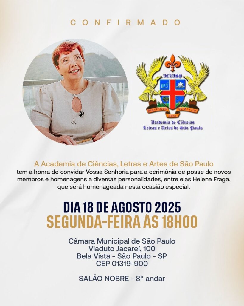 No dia 18 de agosto, nossa querida Helena Fraga terá a honra de ser homenageada pela Academia de Ciências, Letras e Artes de São Paulo.