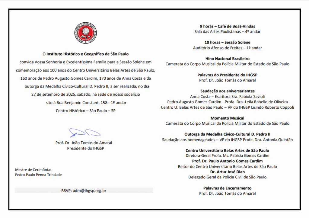 O Instituto Histórico e Geográfico de São Paulo (IHGSP) realizará uma sessão solene para comemorar o centenário do Centro Universitário Belas Artes de São Paulo. O evento acontecerá no dia 27 de setembro de 2025, sábado, na sede do instituto.