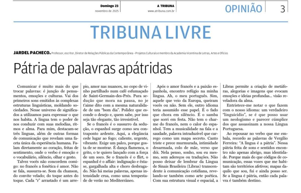 Notícias :: Pátria de palavras apátridas – por Jardel Pacheco – A Tribuna – 23/11/2025