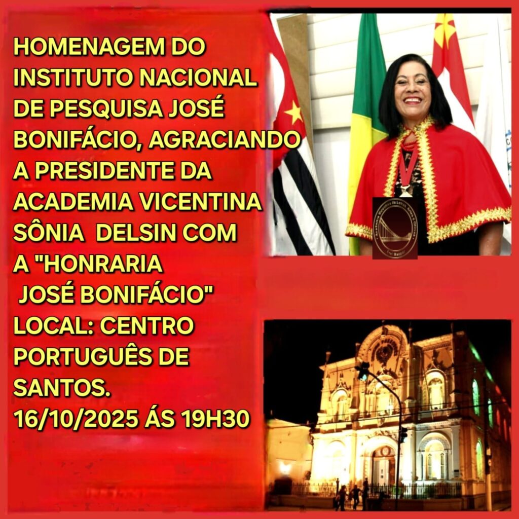 A honraria, intitulada "Honraria José Bonifácio", é um reconhecimento do Instituto Nacional de Pesquisa José Bonifácio aos notáveis serviços e contribuições de Sônia Delsin. A solenidade promete reunir membros da comunidade acadêmica, autoridades locais e entusiastas da cultura para celebrar a trajetória da presidente da Academia Vicentina.
