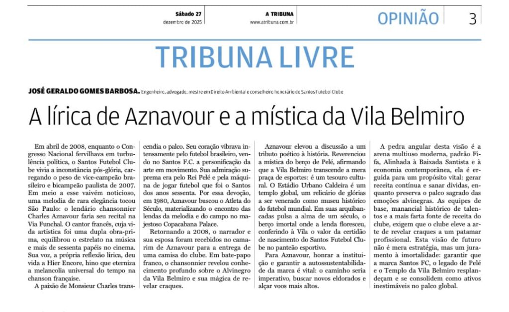 O autor relembra um momento marcante de 2008, quando o cantor francês Charles Aznavour se apresentou em São Paulo e demonstrou profunda admiração pelo Santos Futebol Clube e por Pelé. Aznavour teria feito uma homenagem lírica ao clube, destacando a mística da Vila Belmiro como símbolo de tradição, emoção e identidade cultural.