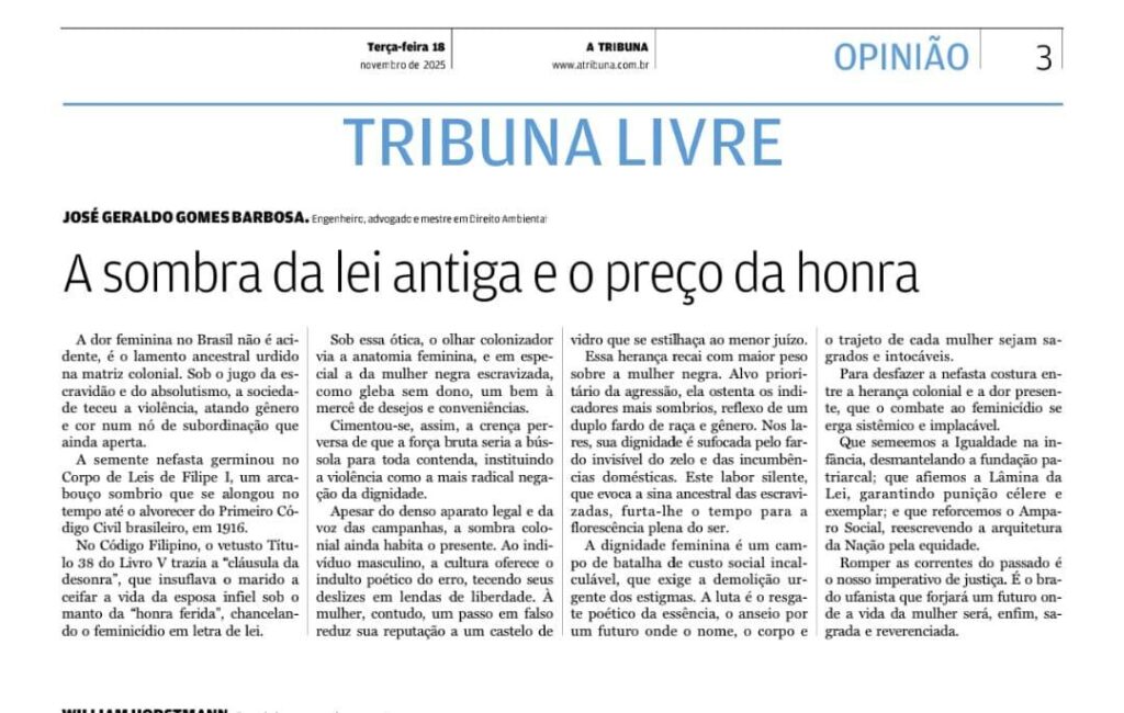 Notícias :: A sombra da lei antiga e o preço da honra – Tribuna Livre 18/11
