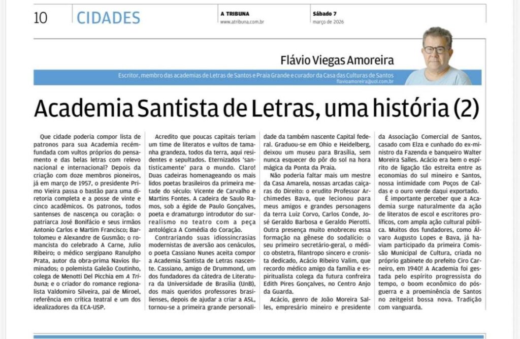 Notícias :: Academia Santista de Letras, uma história (2) por Flávio Viegas Amoreira – A Tribuna 07/03/2026