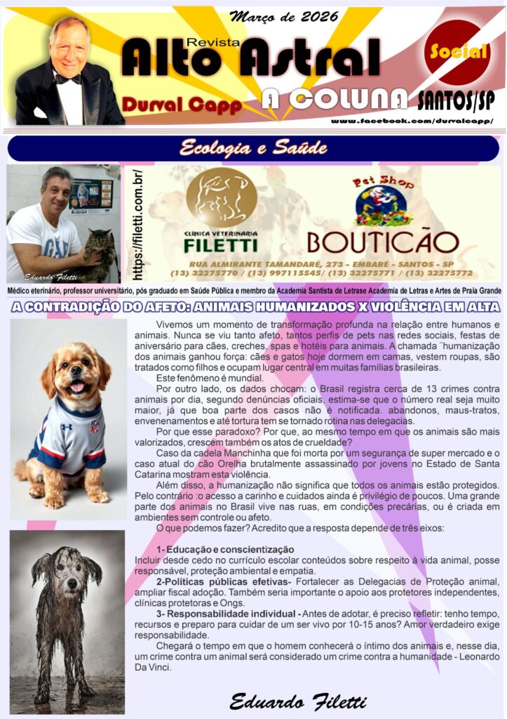 Eduardo Filetti, essa contradição revela que o carinho e os cuidados são privilégio de poucos, enquanto muitos animais vivem em condições precárias ou sofrem violência. Para mudar esse cenário, ele defende três eixos fundamentais: