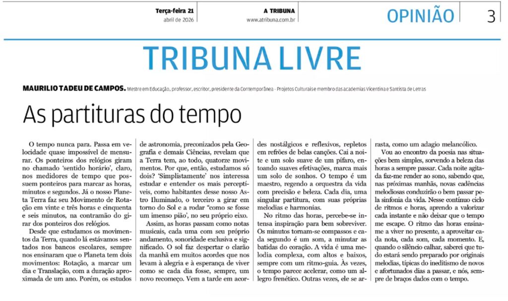 A Tribuna, o professor e escritor Maurilio Tadeu de Campos reflete sobre a passagem do tempo em uma perspectiva filosófica e poética. O autor compara o movimento dos astros e o ritmo da vida ao compasso de uma partitura musical, conduzida por um maestro invisível que organiza cada instante com precisão.