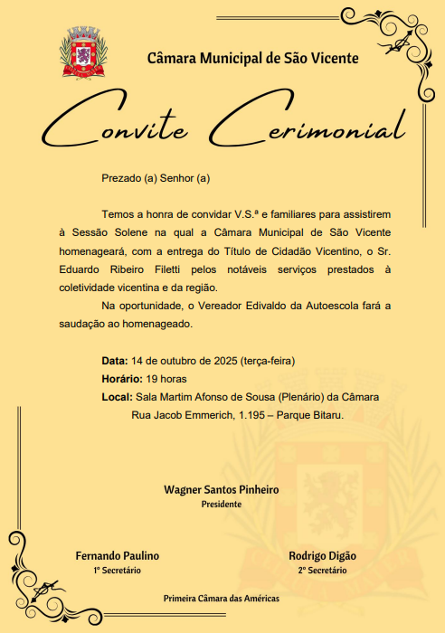 Na última terça-feira, 14 de outubro de 2025, a Câmara Municipal de São Vicente promoveu uma Sessão Solene para homenagear o Sr. Eduardo Ribeiro Filetti, reconhecido pelos notáveis serviços prestados à coletividade vicentina e à região. O evento aconteceu no Plenário Martim Afonso de Sousa, localizado na Rua Jacob Emmerich, 1.195, Parque Bitaru, com início às 19 horas.
