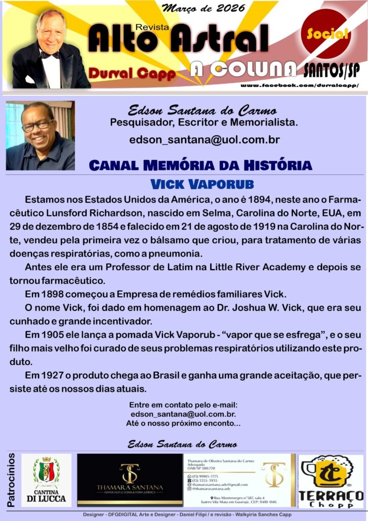 Na edição de março de 2026 da Revista Alto Astral, o pesquisador e memorialista Edson Santana do Carmo trouxe na coluna Canal Memória da História um relato curioso sobre a criação do tradicional bálsamo Vick VapoRub.