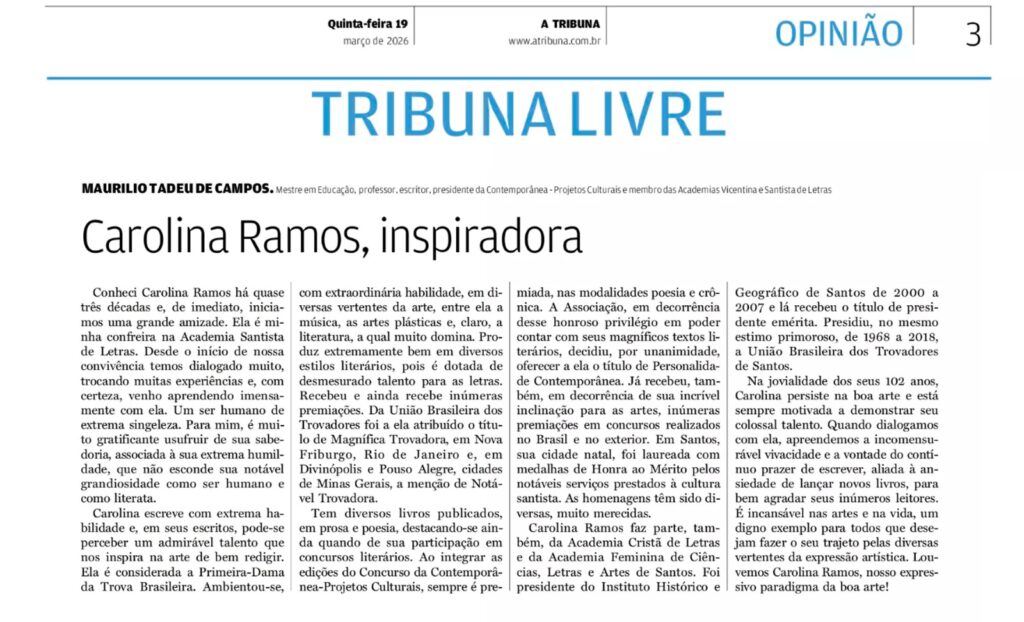 Na edição de 19 de março de 2026 do jornal A Tribuna, a coluna Tribuna Livre trouxe um tributo de Maurílio Tadeu de Campos à escritora e trovadora Carolina Ramos. O texto ressalta a amizade de longa data entre o autor e a homenageada, destacando sua relevância na Academia Santista de Letras e sua trajetória marcada por talento literário, humildade e dedicação às artes.
