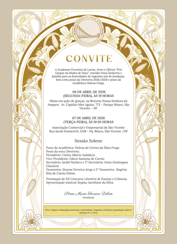 A Academia Vicentina de Letras, Artes e Ofícios “Frei Gaspar da Madre de Deus” realizará, nos dias 6 e 7 de abril, uma programação especial em comemoração aos seus vinte anos de fundação. O convite destaca que a instituição “convida Vossa Senhoria e família para as festividades do vigésimo ano de fundação, bem como posse da Diretoria 2026/2028 e posse da Acadêmica Helena Fraga” .
