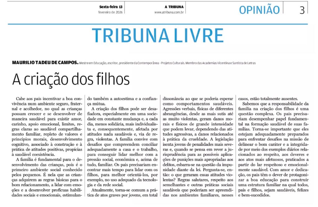 Notícias :: Criação dos filhos – por Maurilio Tadeu de Campos – A Tribuna -13/02/2026