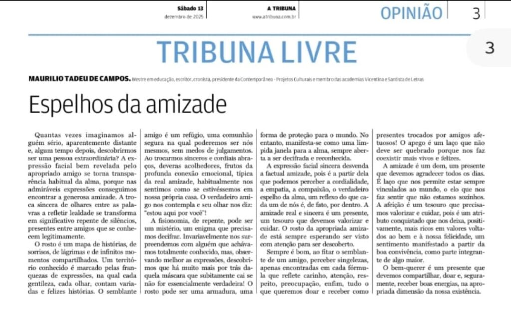 Notícias :: Espelhos da amizade – por Maurilio Tadeu de Campos – A Tribuna 13/12/2025