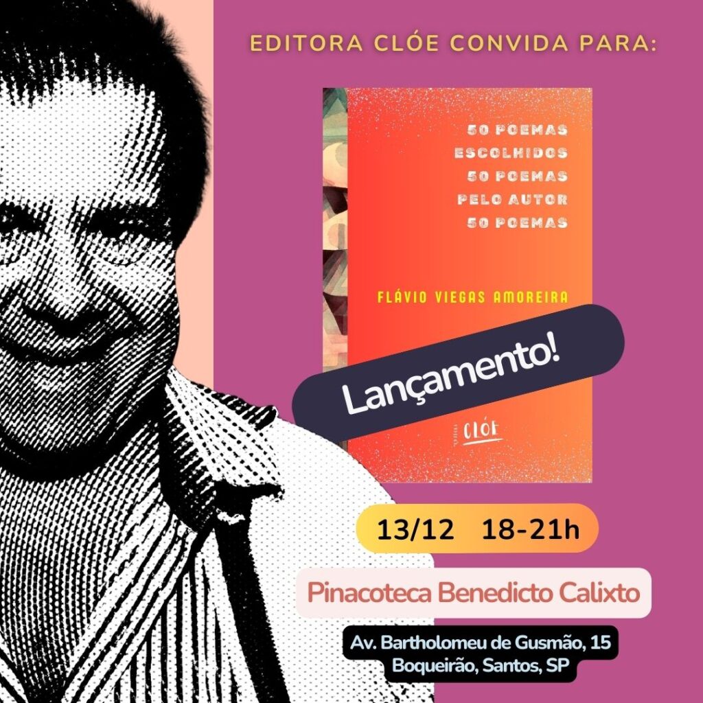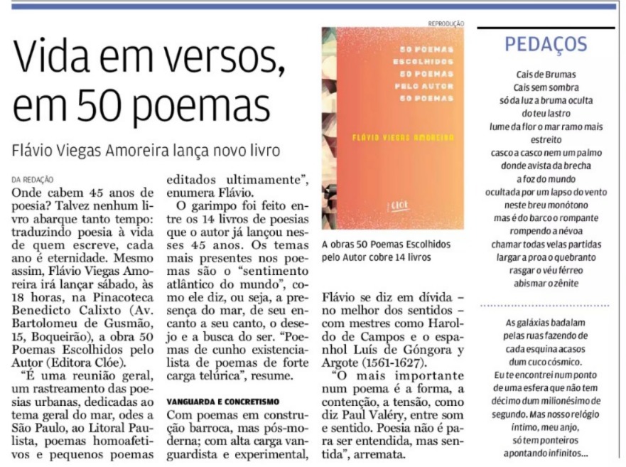 O escritor Flávio Viegas Amoreira lança o livro 50 Poemas Escolhidos pelo Autor, pela Editora Clóe, na Pinacoteca Benedito Calixto, no Boqueirão. A obra reúne poemas de 14 livros publicados ao longo de 45 anos de carreira poética.