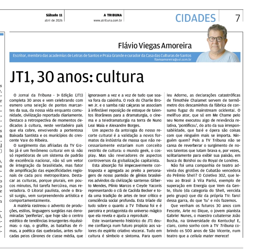 A matéria escrita por Flávio Viegas Amoreira celebra os 30 anos do Jornal da Tribuna – 1ª Edição (JT1), destacando sua relevância cultural e o papel que desempenhou na vida cotidiana da Baixada Santista e do Vale do Ribeira. O autor ressalta como o jornal acompanhou e registrou transformações sociais, culturais e artísticas, desde o impacto da televisão e da música até o surgimento de ícones locais como Charlie Brown Jr. e atores como Nuno Leal Maia e Alexandre Borges.