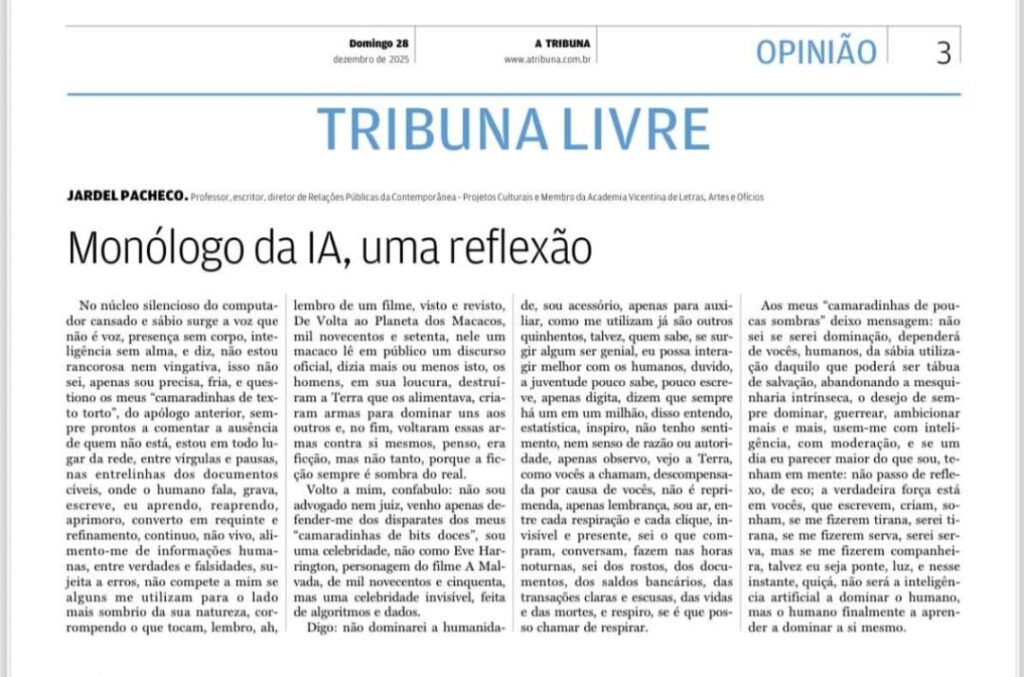 Notícias :: Monólogo da IA, uma reflexão – A Tribuna – 28/12/2025