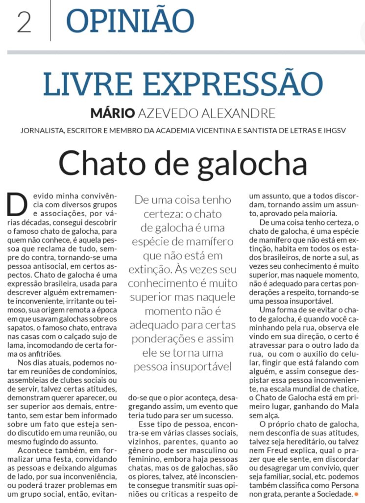 Com linguagem acessível e tom crítico, Alexandre transforma uma expressão popular em objeto de análise cultural, mostrando como o “chato de galocha” é uma figura recorrente e facilmente identificável no cotidiano. O texto combina humor e reflexão, convidando o leitor a reconhecer e pensar sobre comportamentos que, embora comuns, podem desgastar relações sociais.