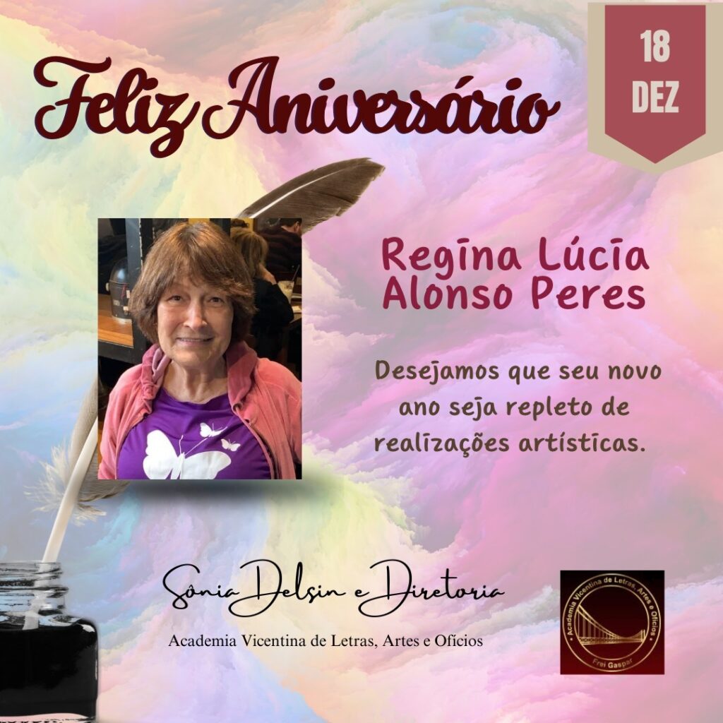 Academia Vicentina de Letras, Artes e Ofícios parabeniza nossa querida associada Regina Lúcia Alonso Peres pelo seu aniversário.