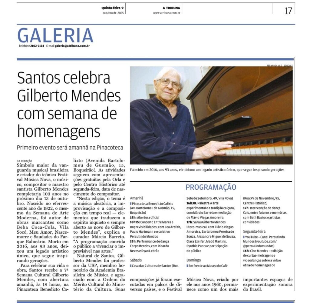 Símbolo maior da vanguarda musical brasileira e criador do icônico Festival Música Nova, o músico, compositor e maestro santista Gilberto Mendes completaria 103 anos no próximo dia 13 de outubro. Nascido em 1922, o mestre da Semana de Arte Moderna, foi autor de obras marcantes como Beba Coca-Cola, Motet em Ré Menor, Santos Football Music, Meu Amigo Koellreutter e Santos Football Music. Falecido em 2016, aos 93 anos, ele deixou um legado artístico único, que segue inspirando gerações.Para celebrar sua obra, desde amanhã até o dia 13, a Semana Gilberto Mendes terá início com um evento na Pinacoteca Benedito Calixto (Avenida Bartolomeu de Gusmão, 15, Boqueirão). As atividades seguem com apresentações gratuitas pela Orla e pelo Centro Histórico até o encerramento da programação.