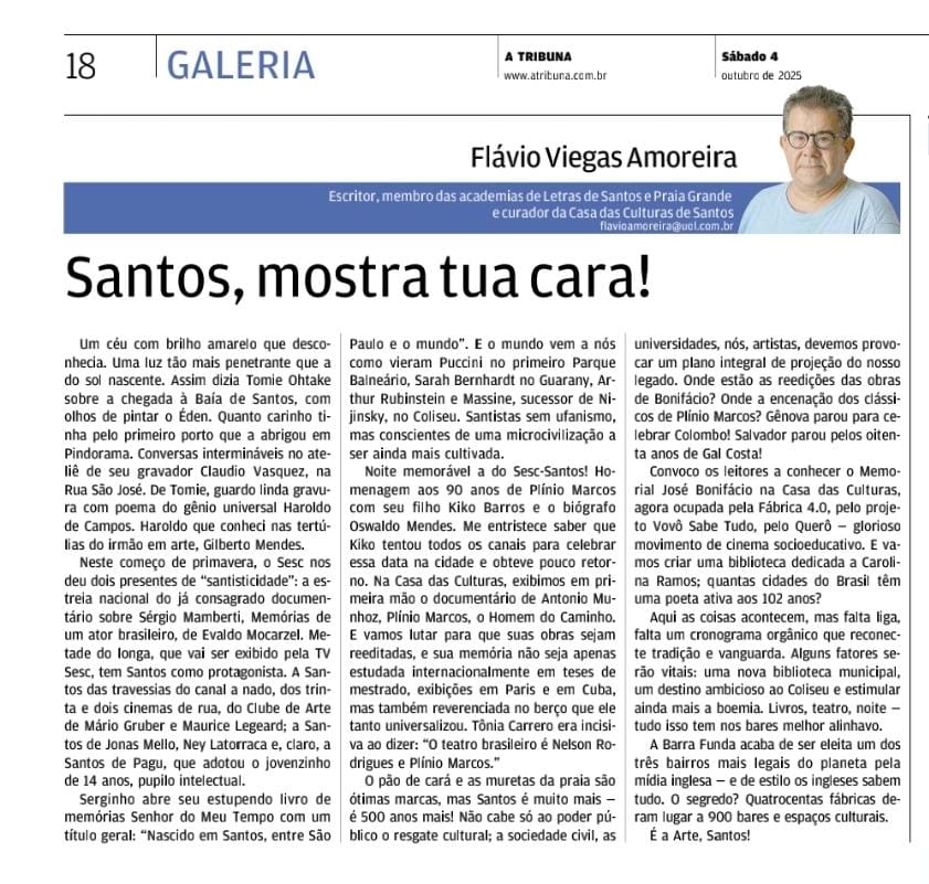 O pão de cará e as muretas da praia são ótimas marcas, mas Santos é muito mais – é 500 anos mais! Não cabe só ao poder público o resgate cultural; à sociedade civil, às universidades, nós, artistas, devemos provocar um plano integral de projeção do nosso legado. Onde estão as reedições das obras de Bonifácio? Onde a encenação dos clássicos de Plínio Marcos? Gênova parou para celebrar Colombo! Salvador parou pelos oitenta anos de Gal Costa!