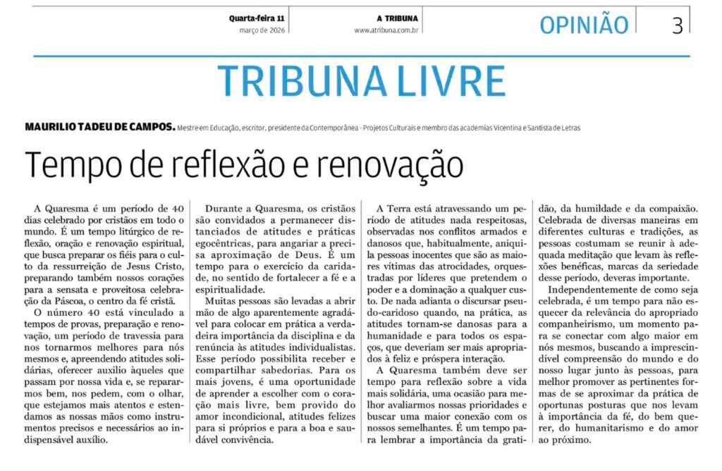 Na edição de 11 de março de 2026 do jornal A Tribuna, o articulista Maurilio Tadeu de Campos, mestre em Educação e presidente da Contemporânea – Projetos Culturais, assina o texto “Tempo de reflexão e renovação” na seção Tribuna Livre.