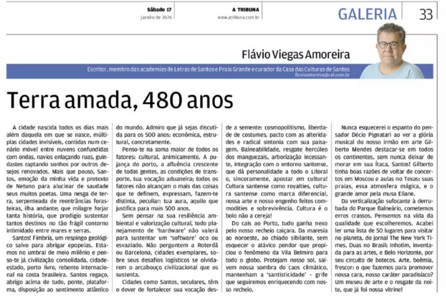 Notícias :: Terra amada, 480 anos por Flávio Viegas Amoreira – A Tribuna de 17/01/2026