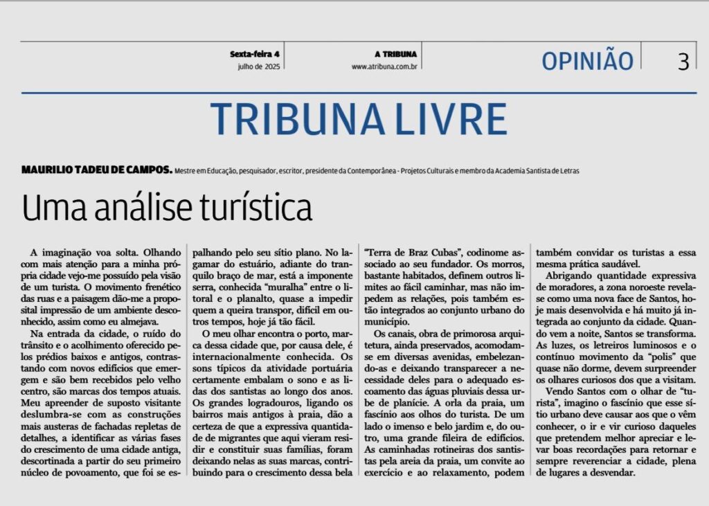 Notícias :: Uma Análise Turística – Por Maurilio Tadeu de Campos – “A Tribuna – Edição de 04/07/2025”